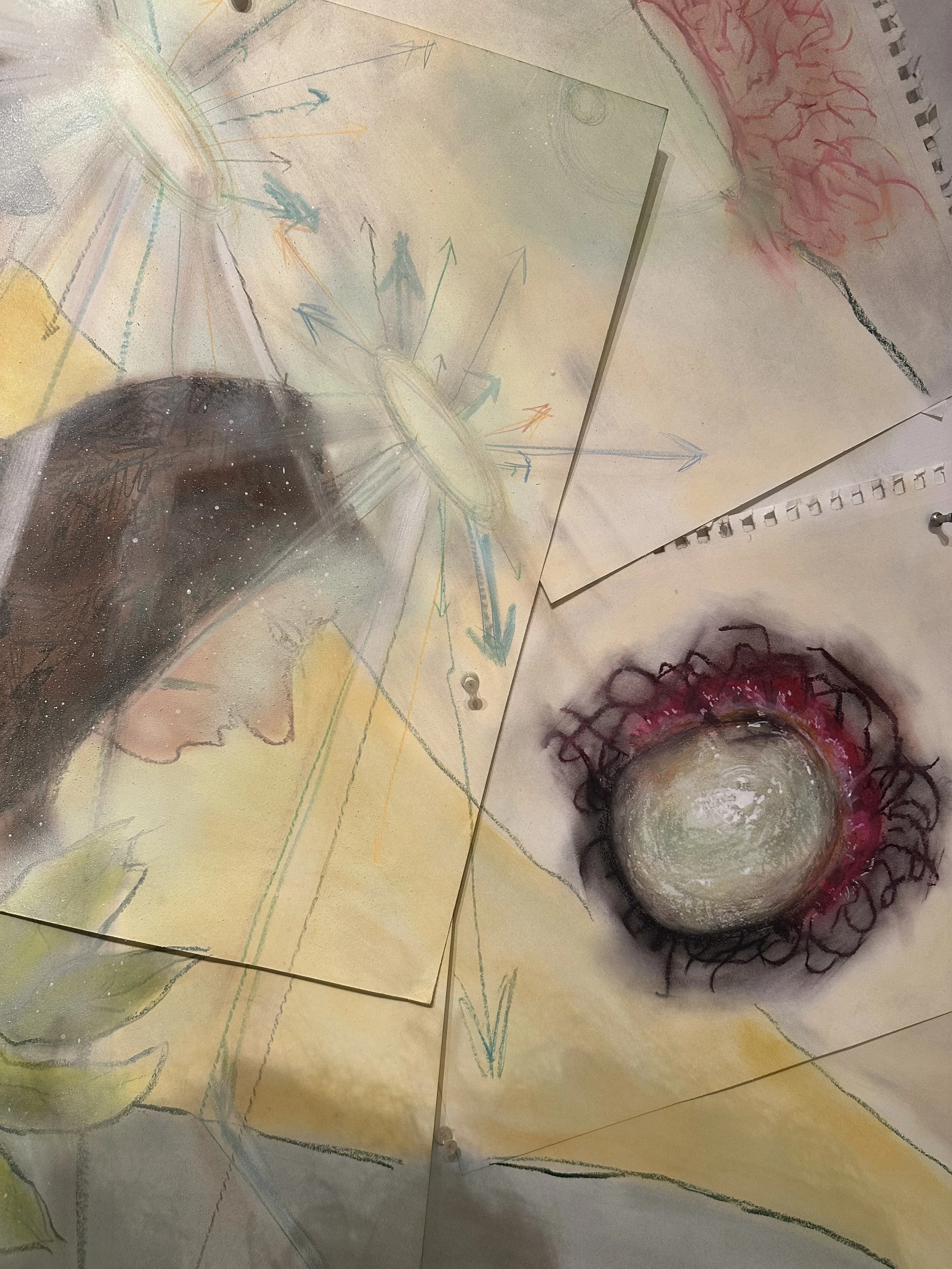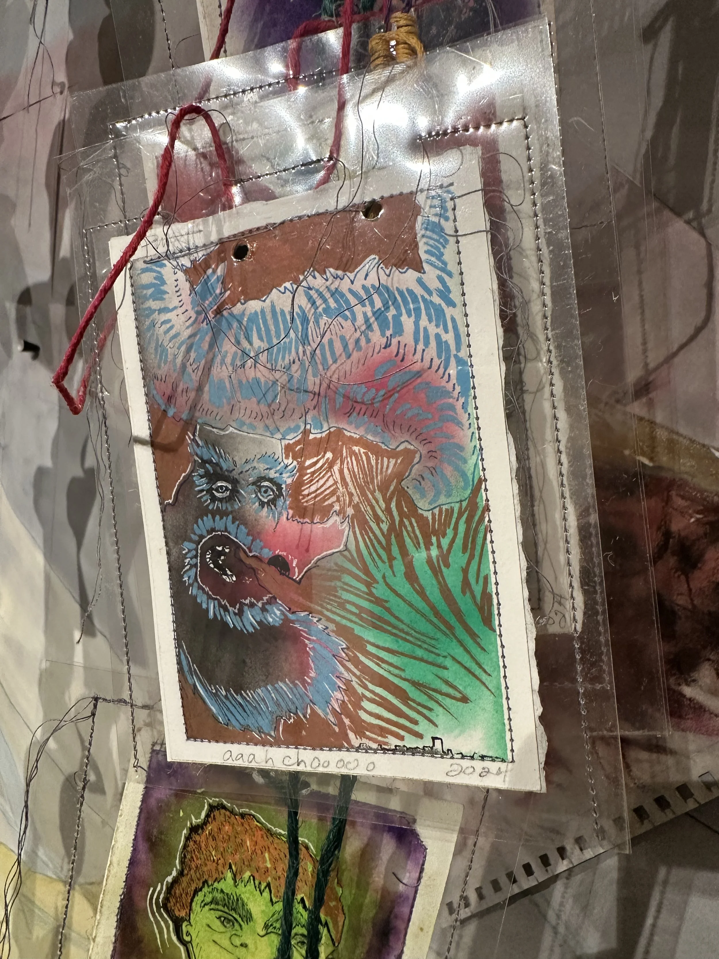 Watercolor, Pastel, Graphite, spray paint, oil pastel colored pencil, string, plastic on paper