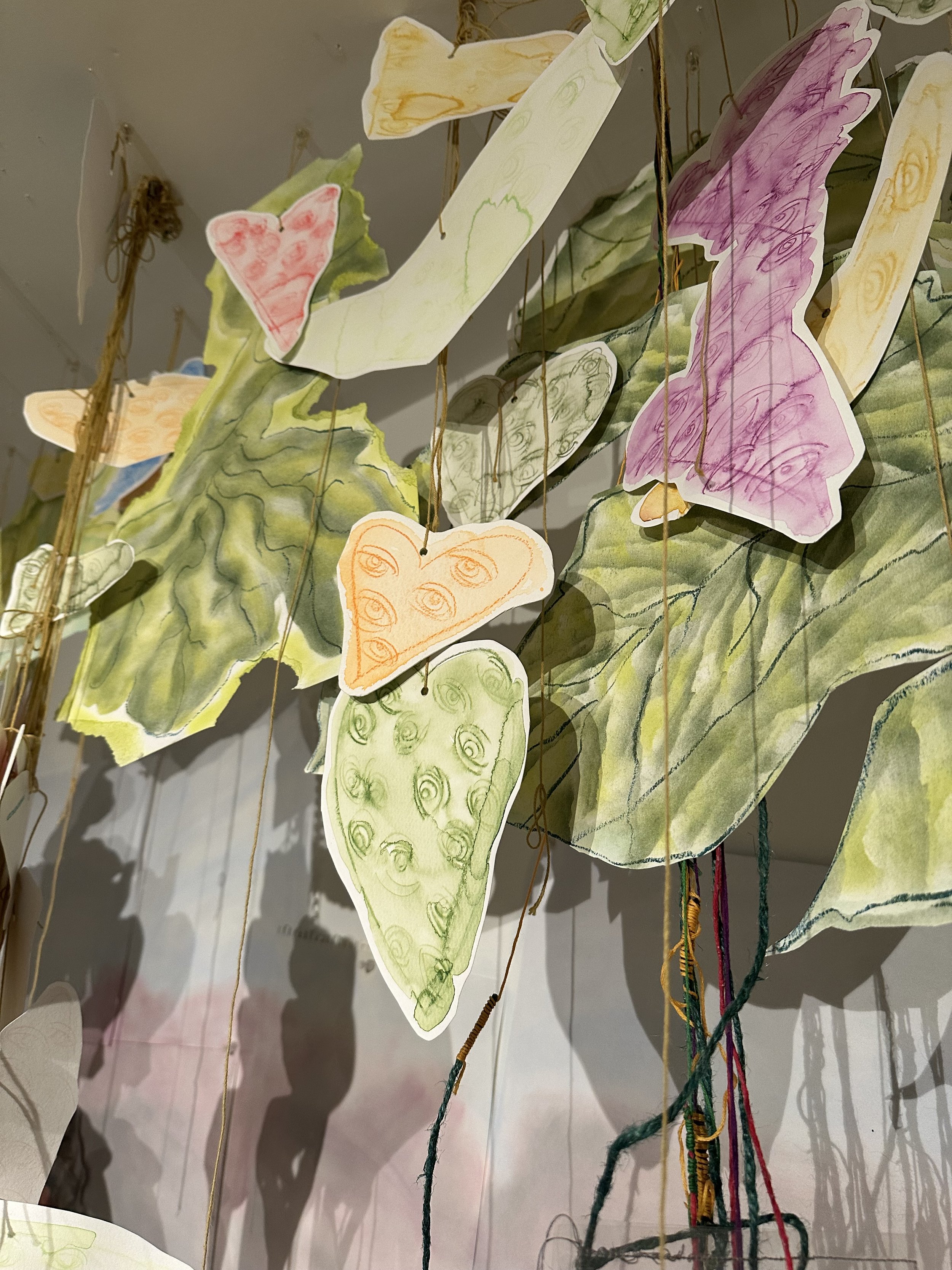 crayon, pastel on paper in wood frame with glass, feet and Blue hearts are Acrylic on canvas sewn and stuffed with pillow batting, Pinned to wall
